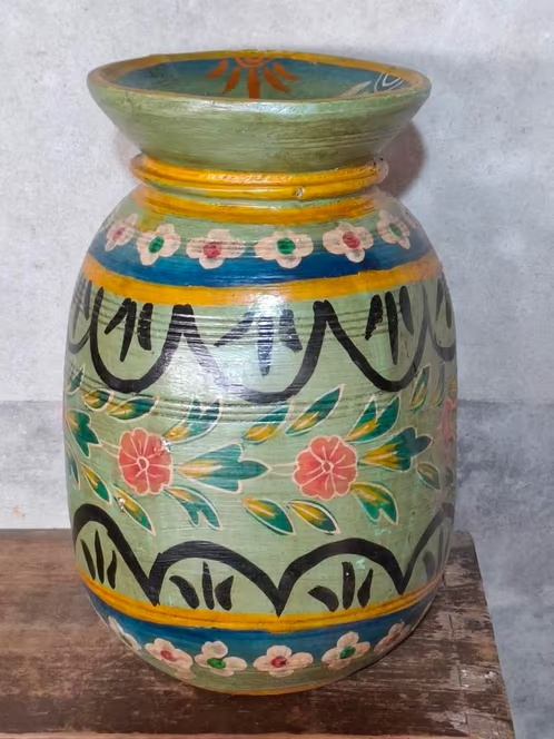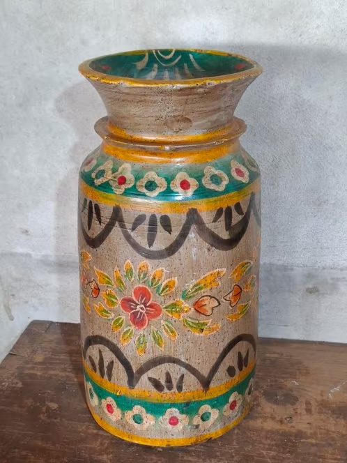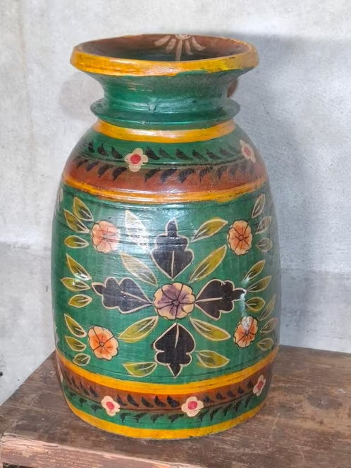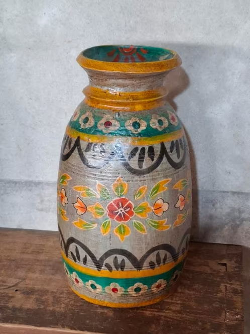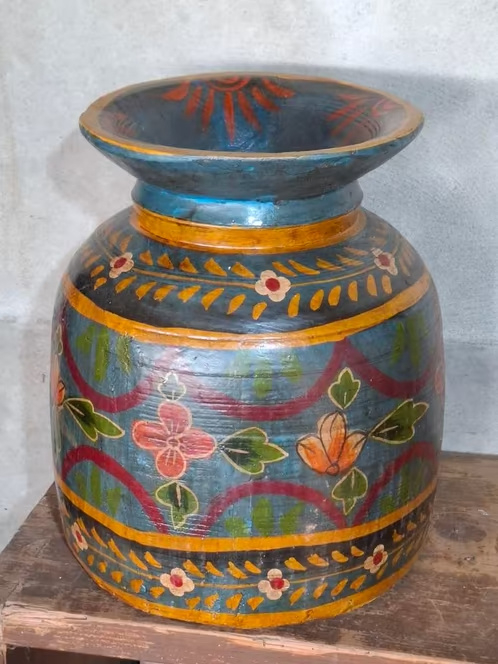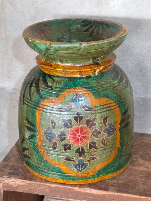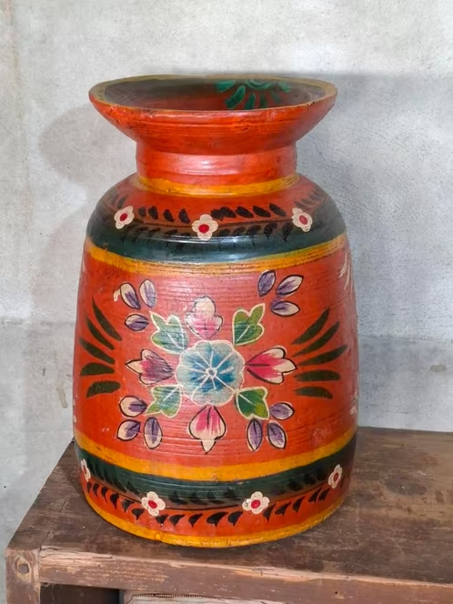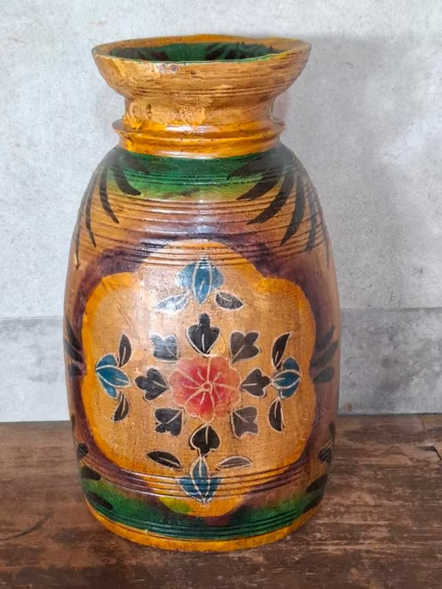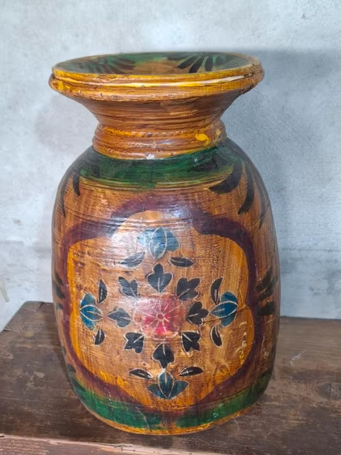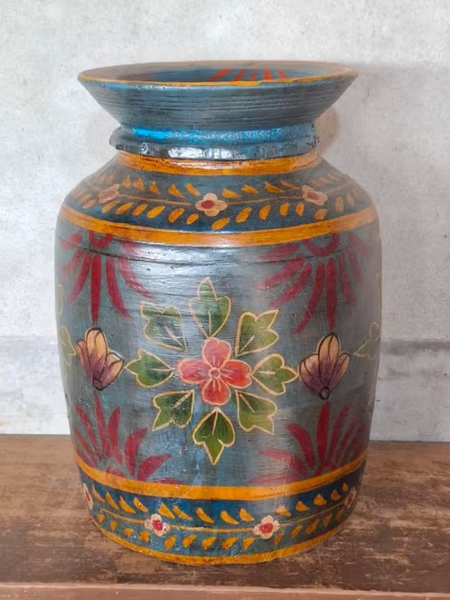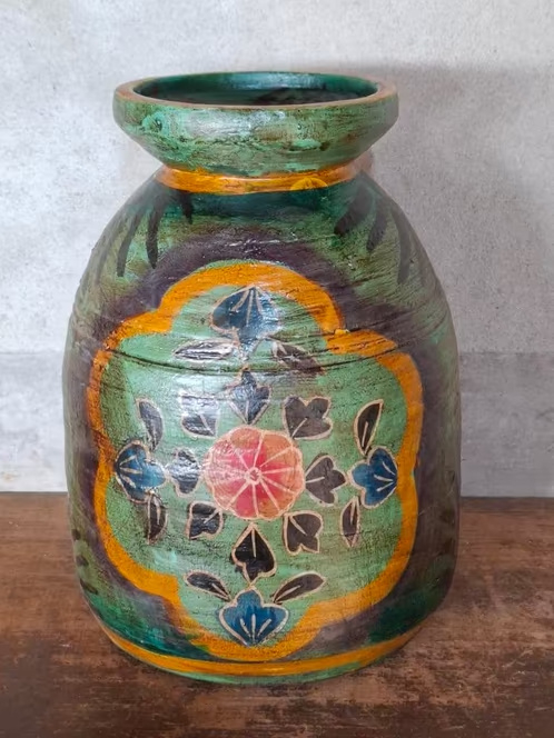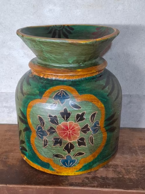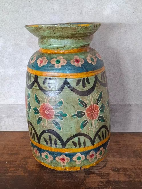 Oude Vintage Houten Indiase Waterkruik HandbeschilderdHand beschilderde Nepalese houten vaas